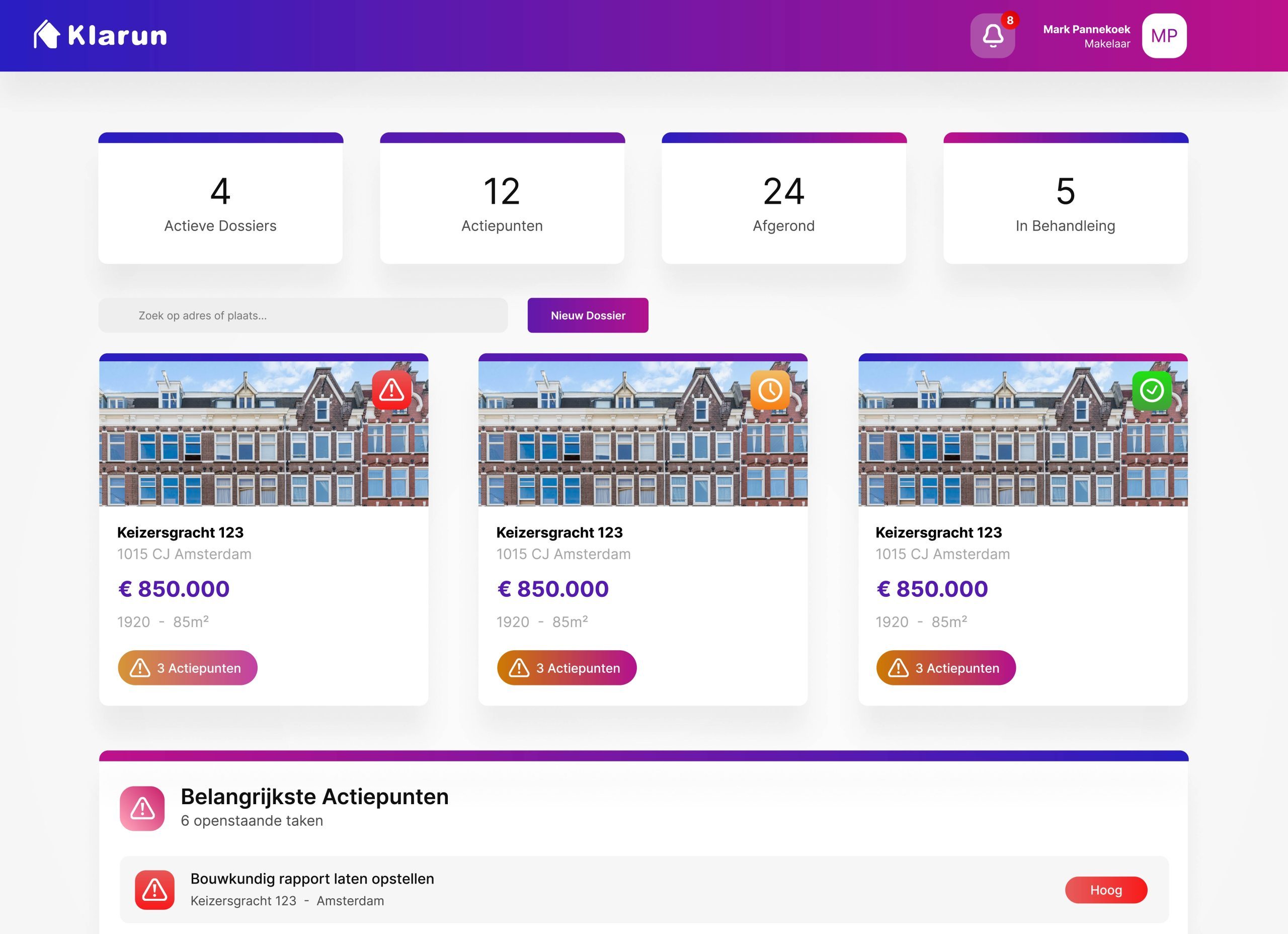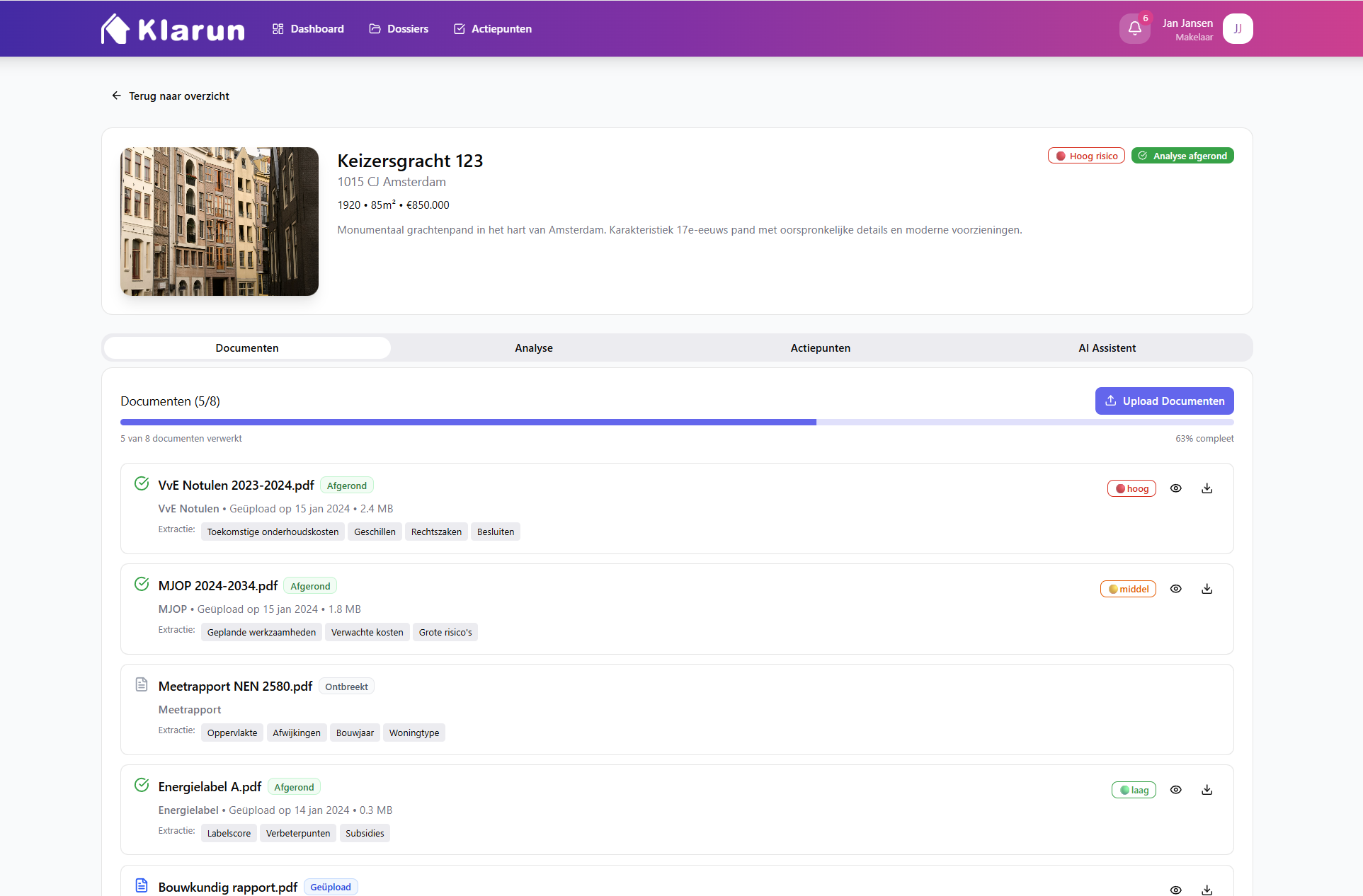 Klarun analyseert alle documenten van een object en toont direct alle risico’s, bijzonderheden en actiepunten.